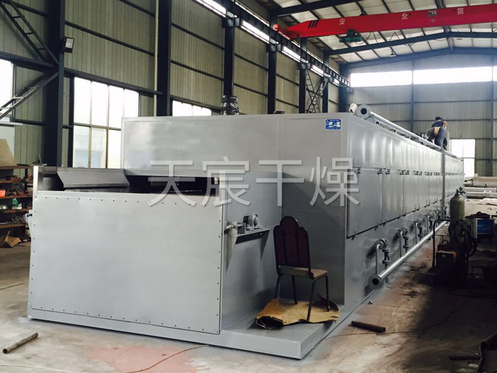 物料由加料器均勻地鋪在網(wǎng)帶上,網(wǎng)帶一般采用12-60目不銹鋼絲網(wǎng),由傳動裝置拖動在干燥機(jī)內(nèi)移動。干燥機(jī)由若干單元組成,每一單元熱風(fēng)獨(dú)立循環(huán),部分尾氣由專門排濕風(fēng)機(jī)排出,廢氣由調(diào)節(jié)閥控制,熱氣由下往上或由上往下穿過鋪滿物料的網(wǎng)帶完成熱量與質(zhì)量傳遞的進(jìn)程,帶走物料水份。網(wǎng)帶緩慢移動,運(yùn)行速度可根據(jù)物料溫度自由調(diào)節(jié),干燥后的成品連續(xù)落入收料器中。上下循環(huán)單元根據(jù)用戶需要可靈活配備,單元數(shù)量亦可根據(jù)需要選取。