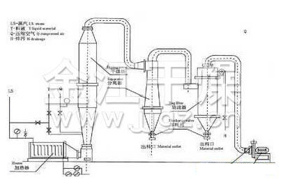 將壓縮空氣或者是水蒸汽用≥300m/s的速度從噴嘴噴出,靠氣液兩者間的速度差產(chǎn)生的摩擦力,使液料分離成細(xì)小的霧滴。霧滴與熱空氣的充分接觸并經(jīng)行熱交換,在10-30秒內(nèi)迅速完成整個干燥過程。
